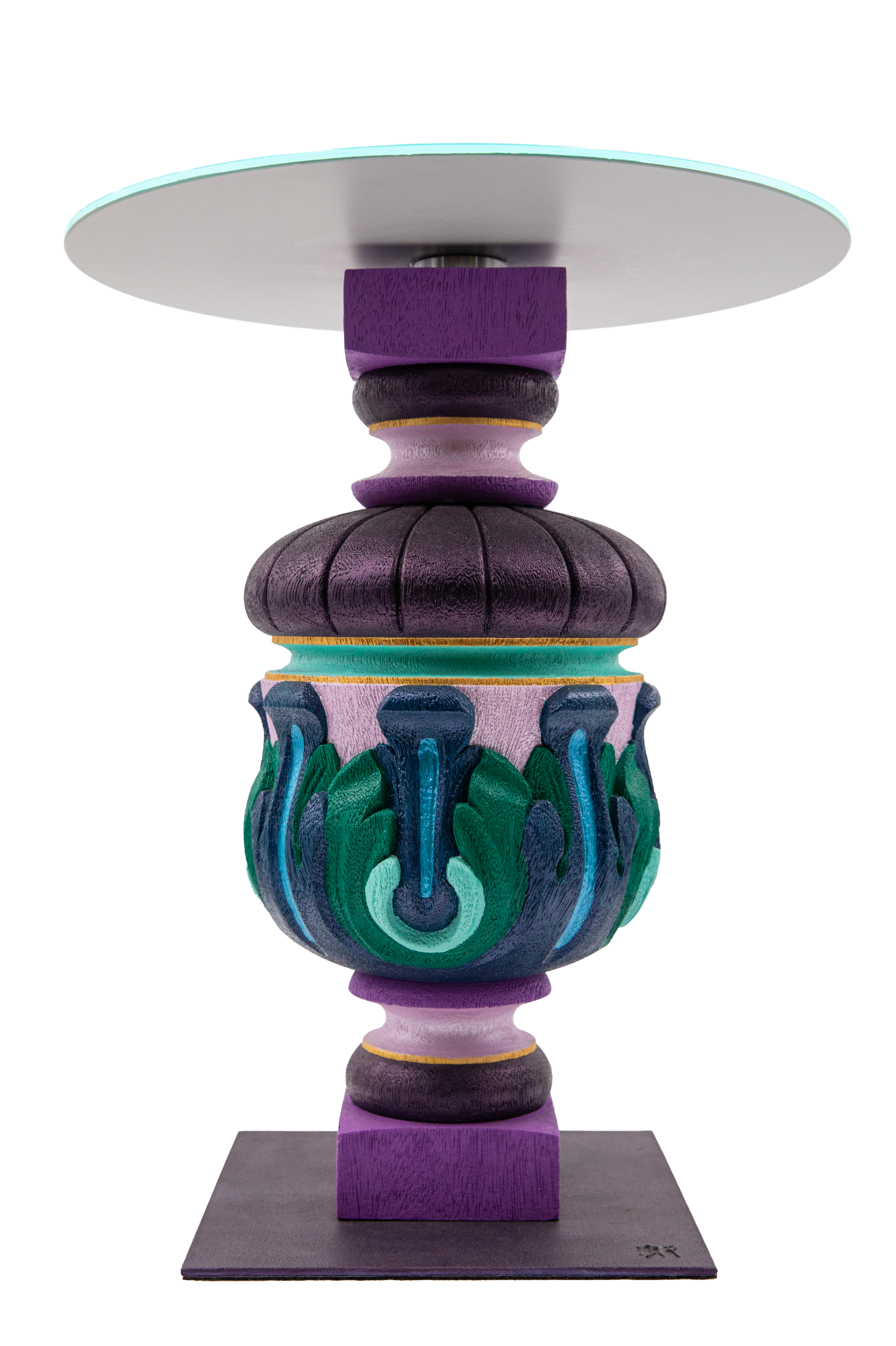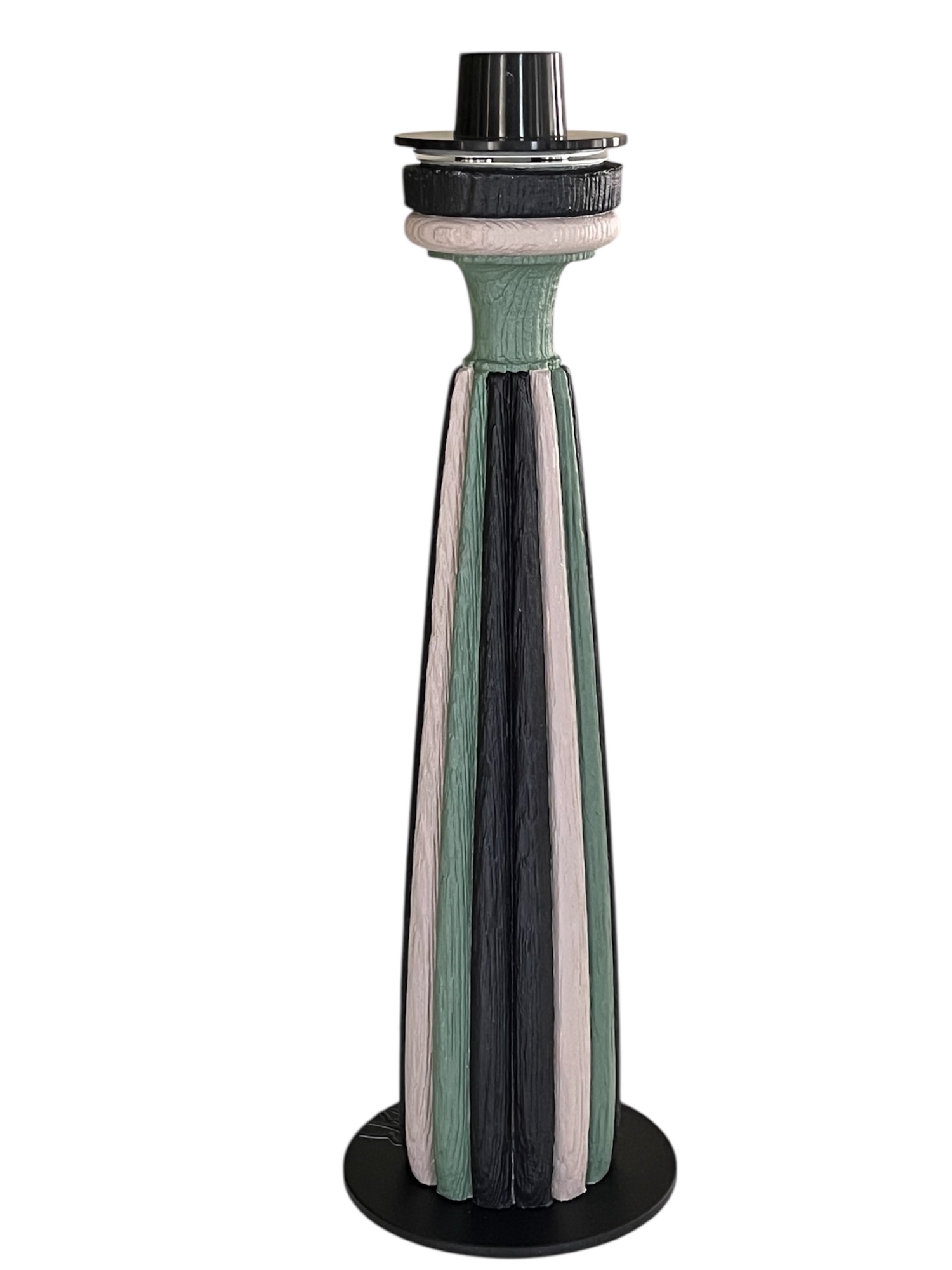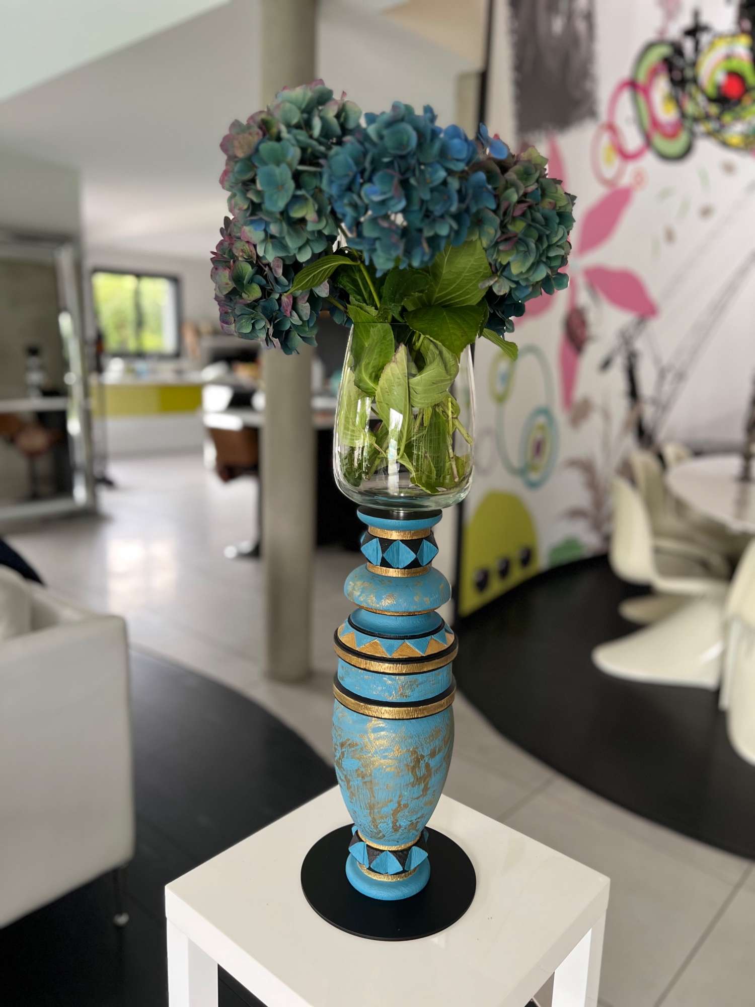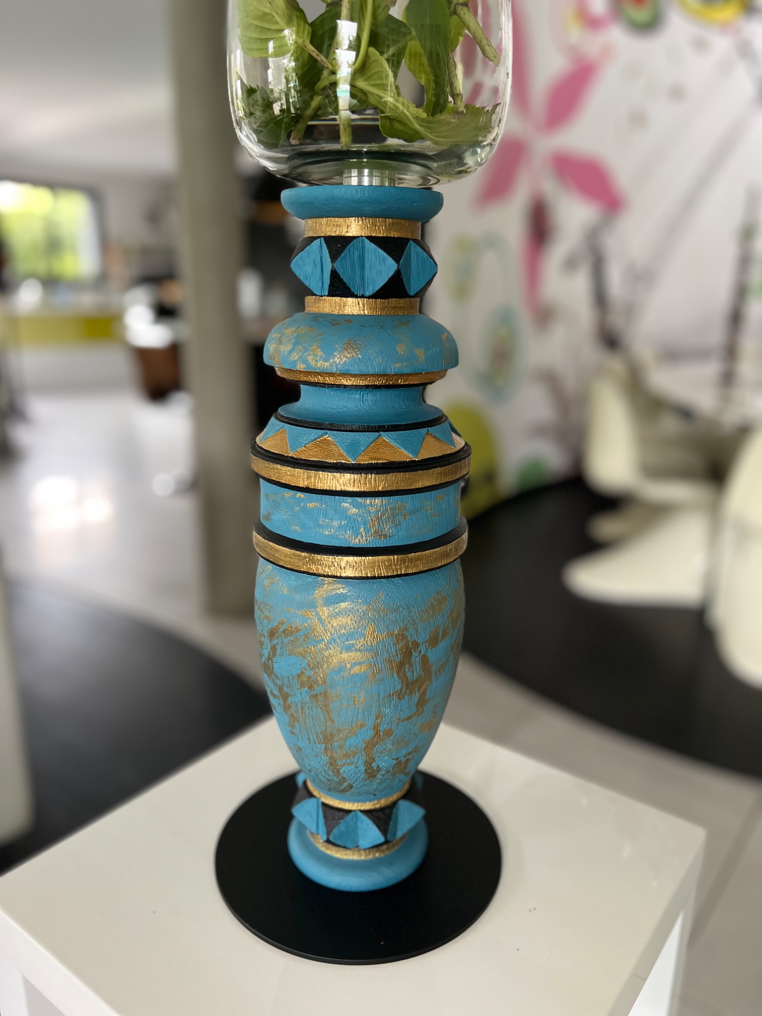 Pièce unique en bois massif, peint à la main, de couleur bleu noir et or antique. Vase de 20 cm maintenu par une platine qui se visse pour une meilleur stabilité. Socle en acier peint en noir brillant. Finition vernis et peinture acrylique.