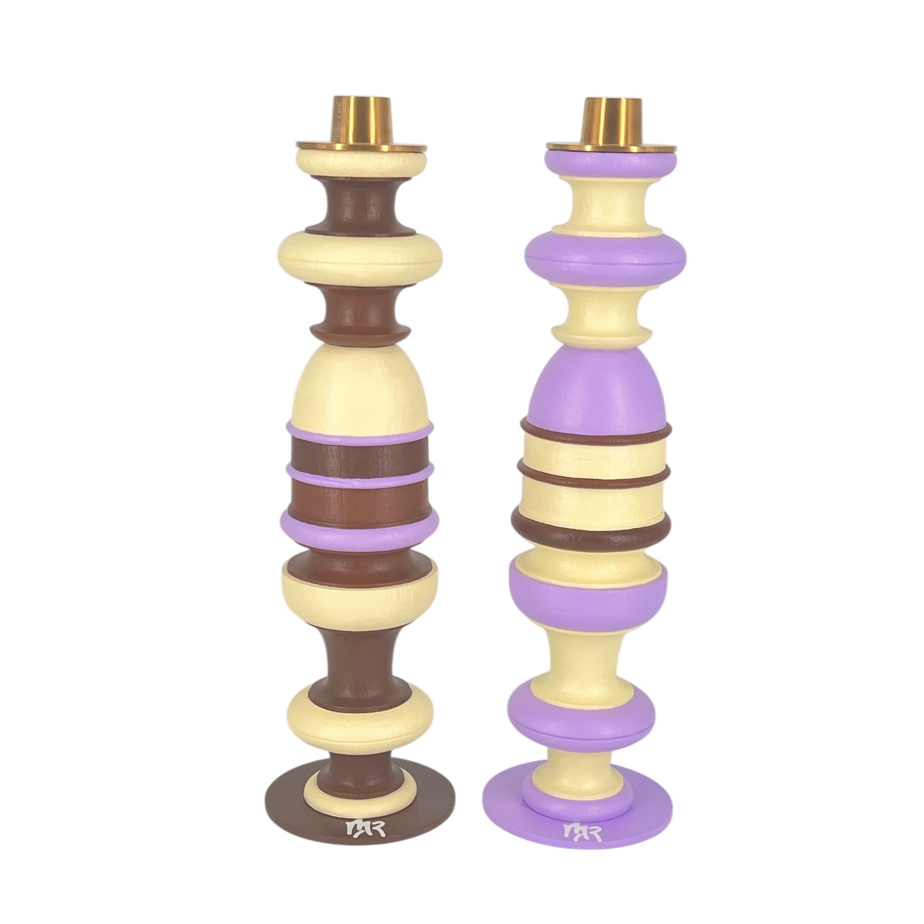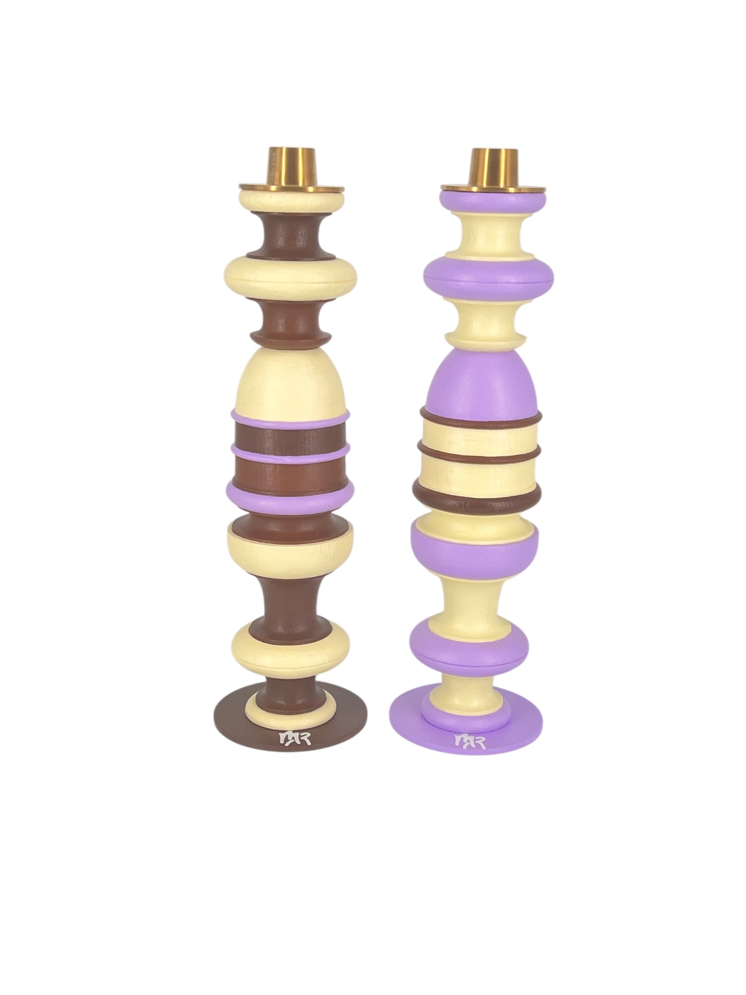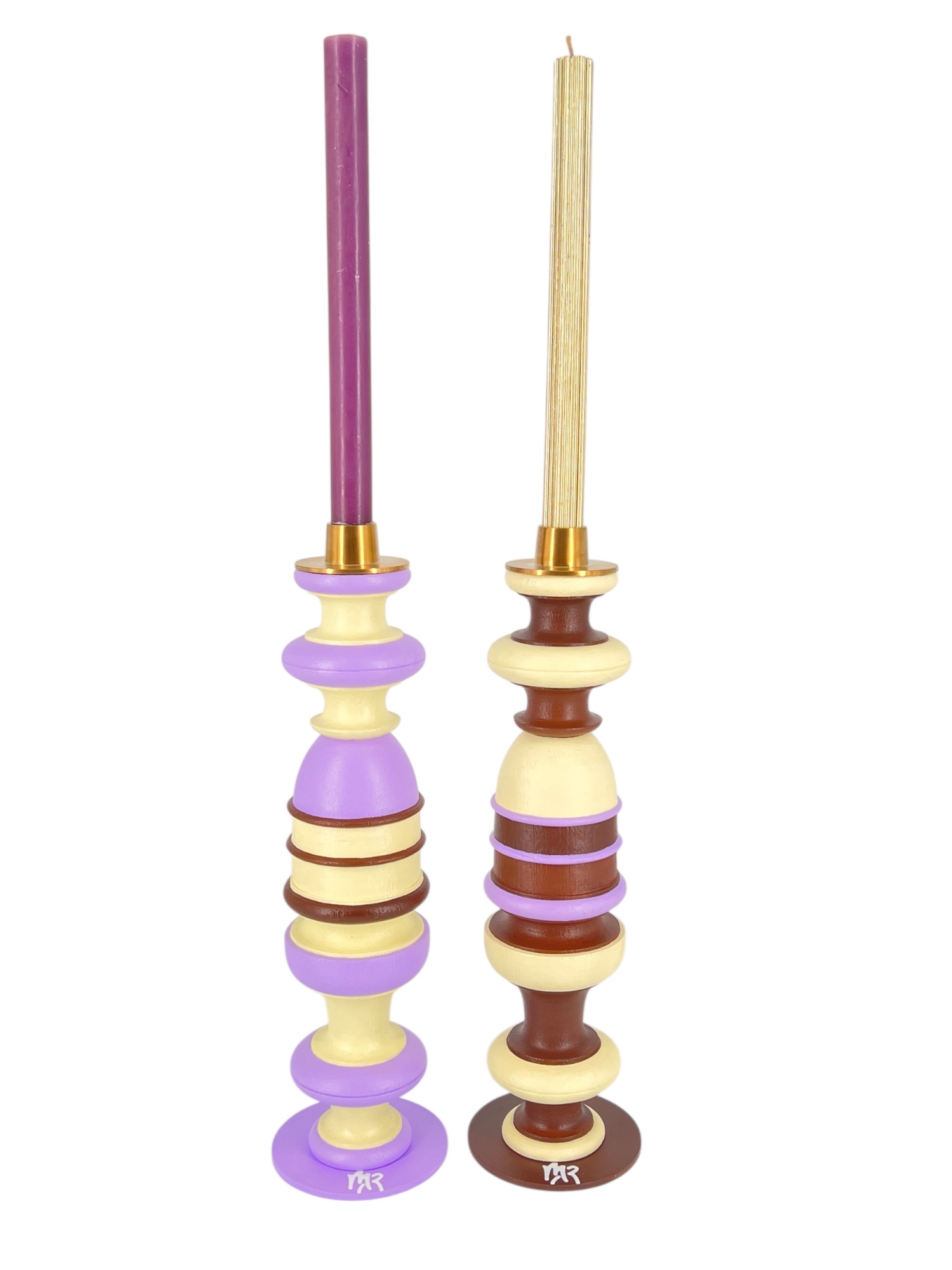Pièce en bois massif peint à la main. Socle en acier de couleur parme ou chocolat . Bougeoirs doré mat d'Ester&Erik maintenus par un aimant. Finition peinture et vernis acrylique. Vendus par 2.