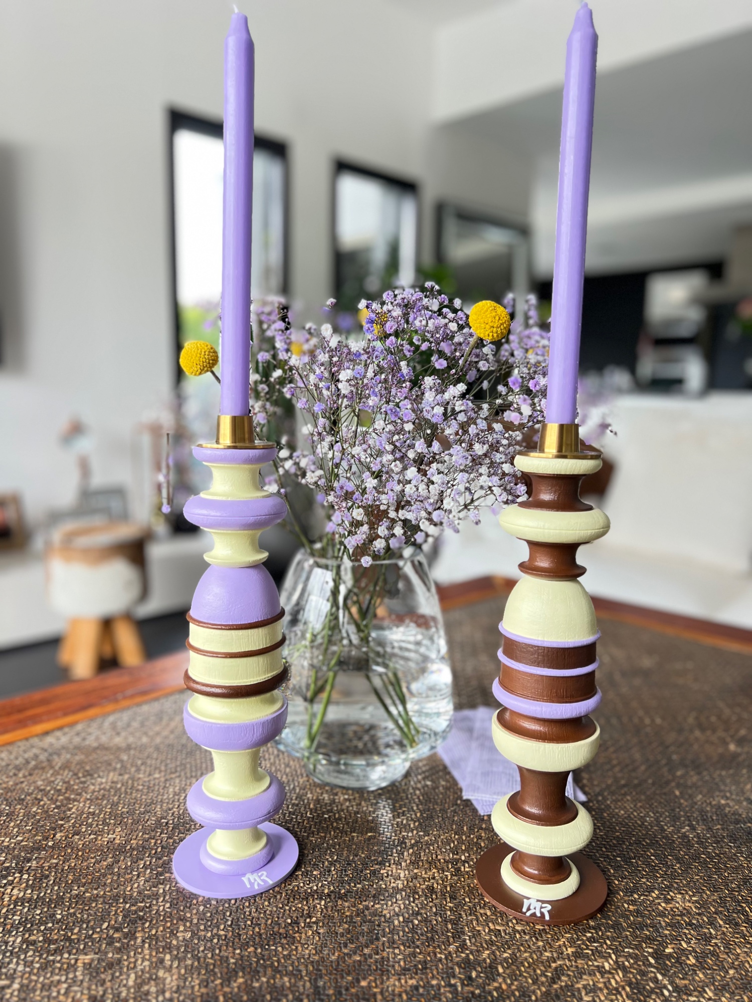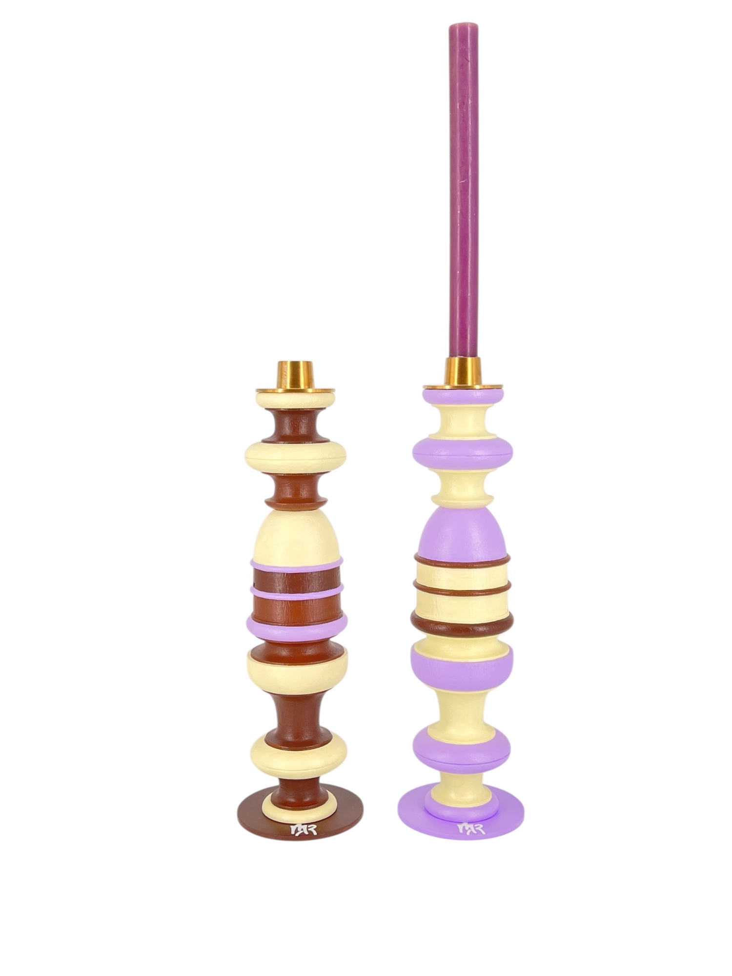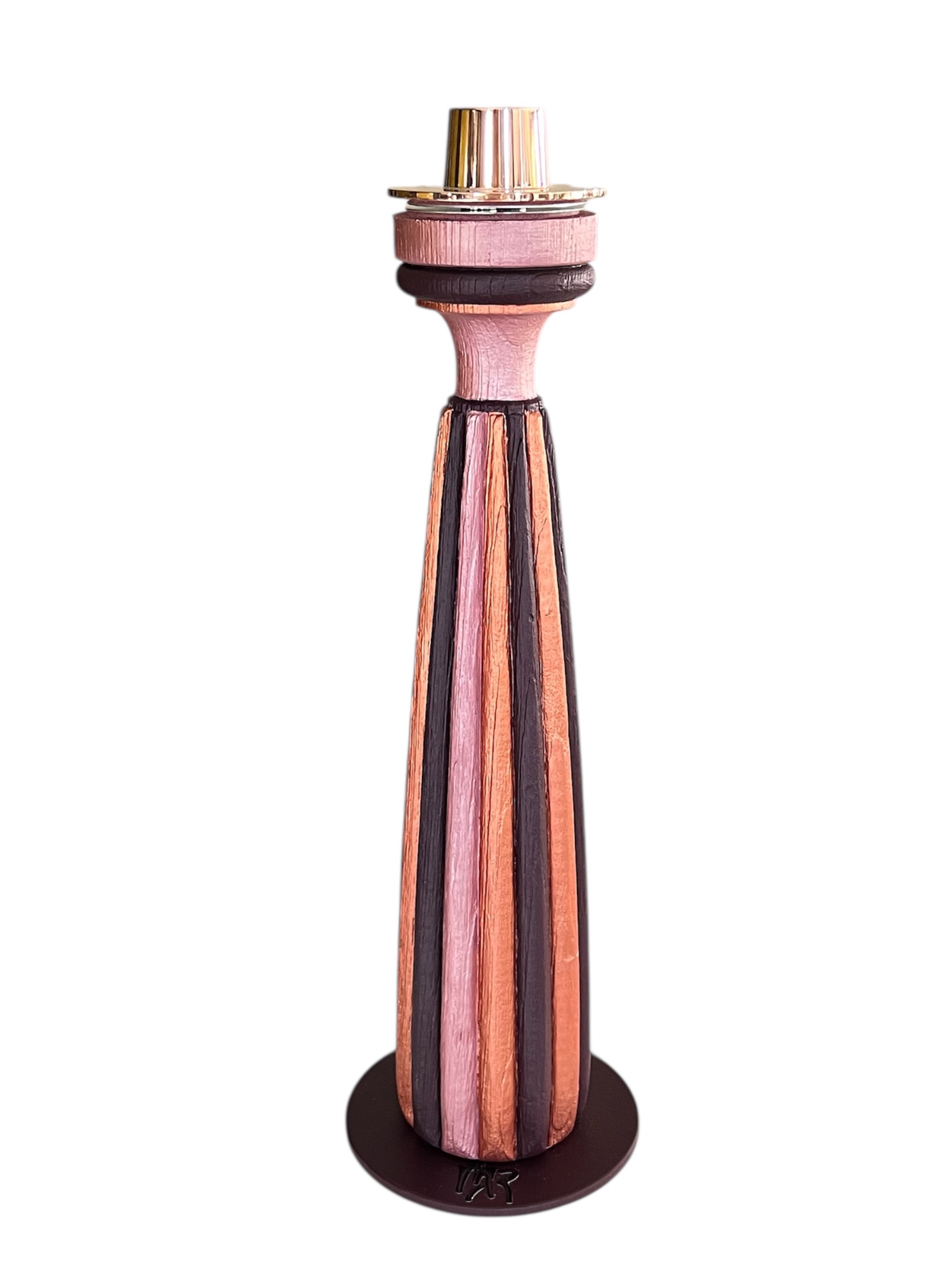 Pièce en bois massif peint à la main. Socle en acier de couleur parme ou chocolat . Bougeoirs doré mat d'Ester&Erik maintenus par un aimant. Finition peinture et vernis acrylique. Vendus par 2.